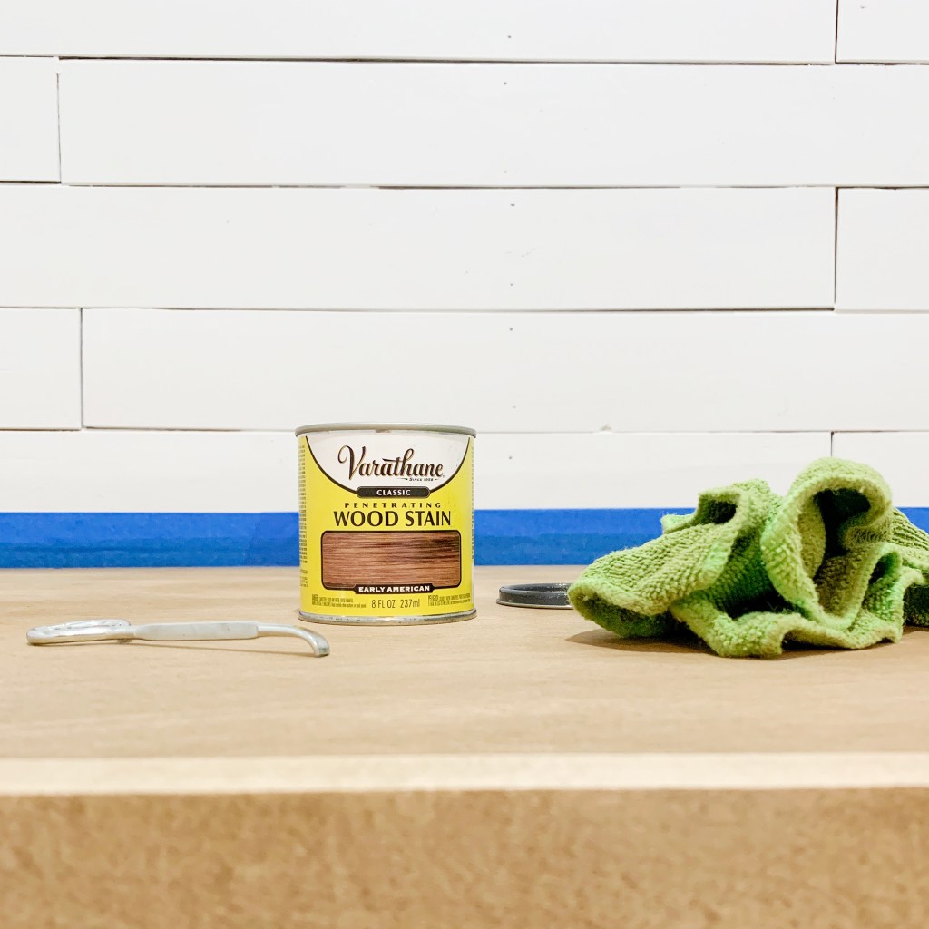 The last step for this desk (if you choose to do so) is to sand & stain. The natural wood color was pretty, but we decided to do a very light coat of Early American. I used a rag to apply it and immediately wiped off the excess. Obviously the more coats you apply, the darker the stain will become.