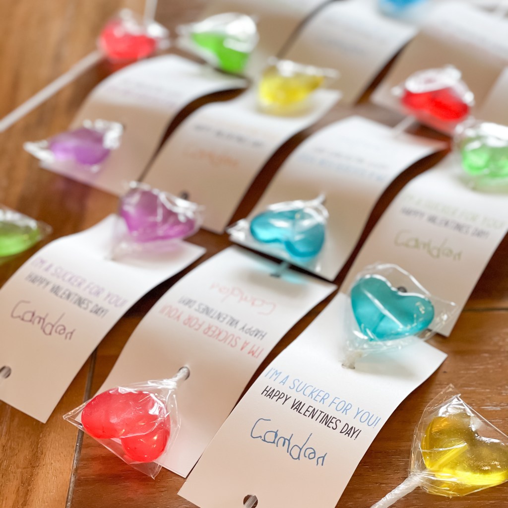 These sucker Valentine’s are SO easy and SO cute. I found the heart shaped suckers in the seasonal aisle at Walmart.