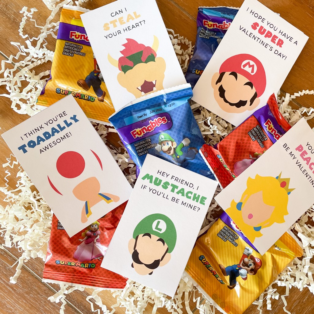 For the Super Mario fans – these minimalist Mario Valentine’s were a hit. We paired them with some Super Mario fruit snacks.
