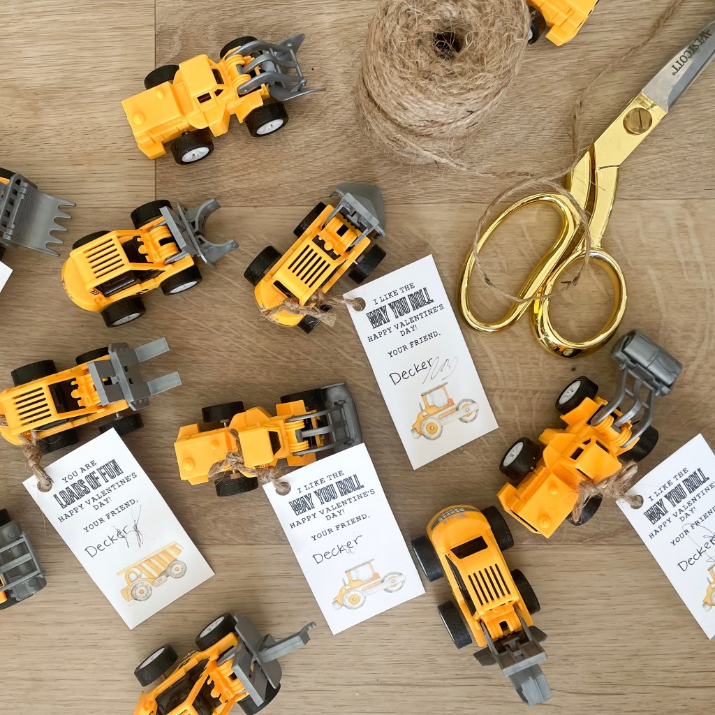 These pull back construction vehicles paired perfectly with these construction themed tags.