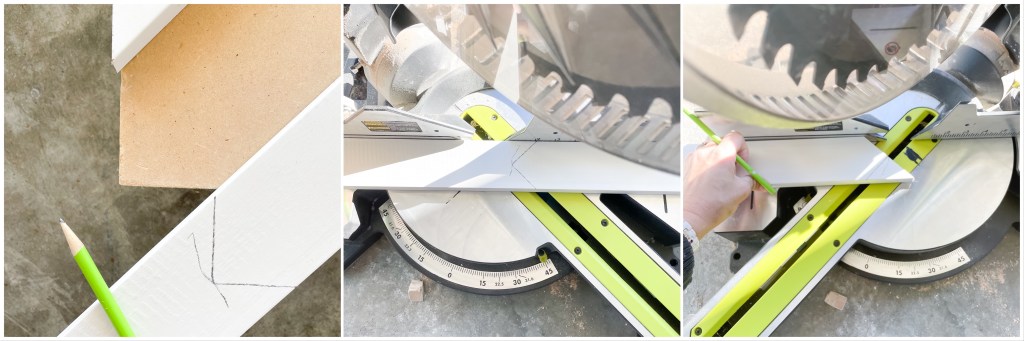 Next I took 2 of the primed finger joint boards and cut one end of each at a 45 degree angle. Using my center line as a starting point I set them in place and marked on the opposite edge where I needed to cut – no measuring required! Once you have your first boards cut to size, add a little bit of construction adhesive and top it off with several brad nails to hold them in place.