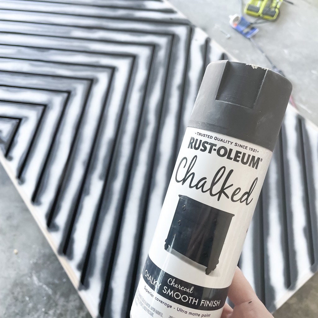 Once you’ve sanded its time for paint. This is where a paint sprayer would come in handy! I chose to paint my door Satin Black by Behr. I used Charcoal Chalk Spray Paint to get into all the hard to reach placed first (it’s essentially the same color), then used a smooth roller to coat the rest of the door. If you don’t have a paint sprayer I highly recommend either cutting in with a brush as you lay your design down OR do what I did and use a paint that’s color matched to a spray paint of some kind. That way you don’t have to struggle getting paint in all the nooks and crannies.