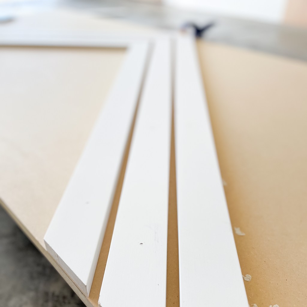 As mentioned previously my door is 84” x 40”. I used a sheet of 3/4” MDF as my base layer and had Home Depot cut it to size for me in the store. If you plan on adding trim around the edges like I did be sure to subtract 1.5” from the finished height and width you’re wanting to accommodate the 1×2 trim boards.
