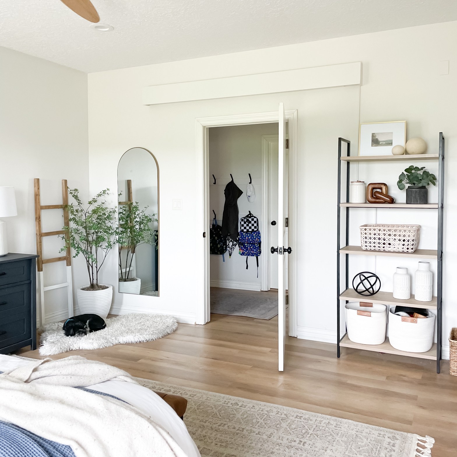 Since we have a power cord on our screen I used a paintable cord cover to keep the cord in place & ran it behind a shelf we happened to have on the same wall. It worked out perfectly! Looking in the room you would never even know it’s there. I also want to note that they do have non-powered screens if you don’t have a way to hide a cord.